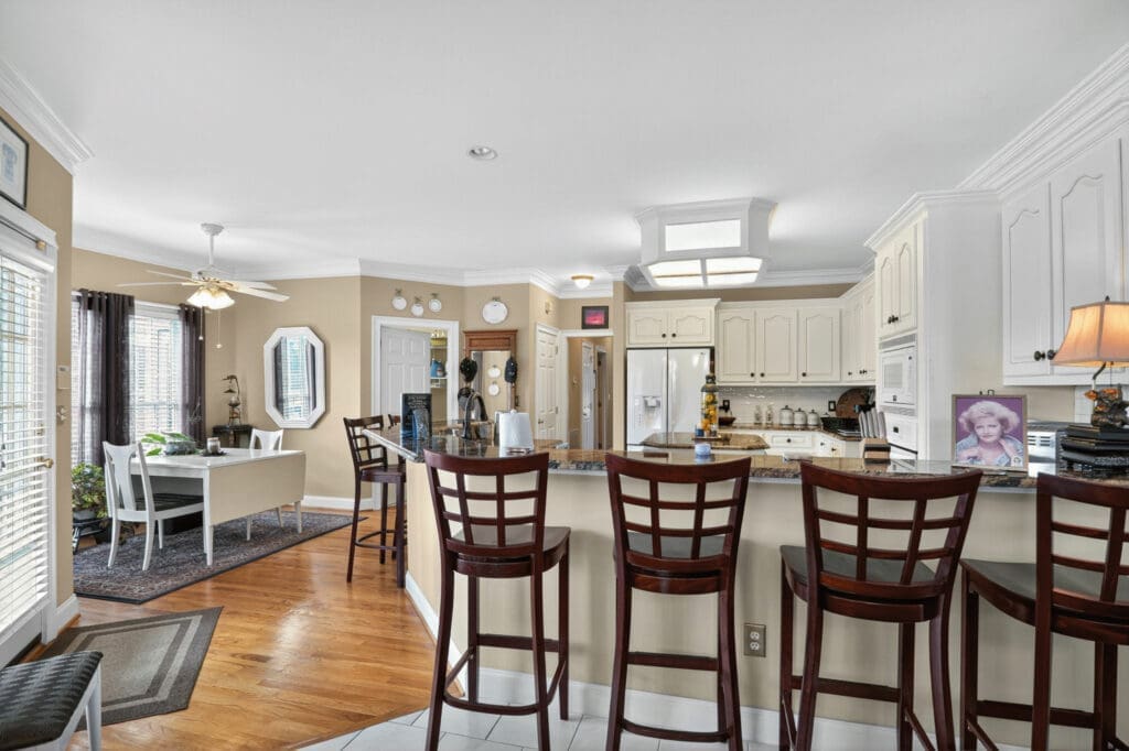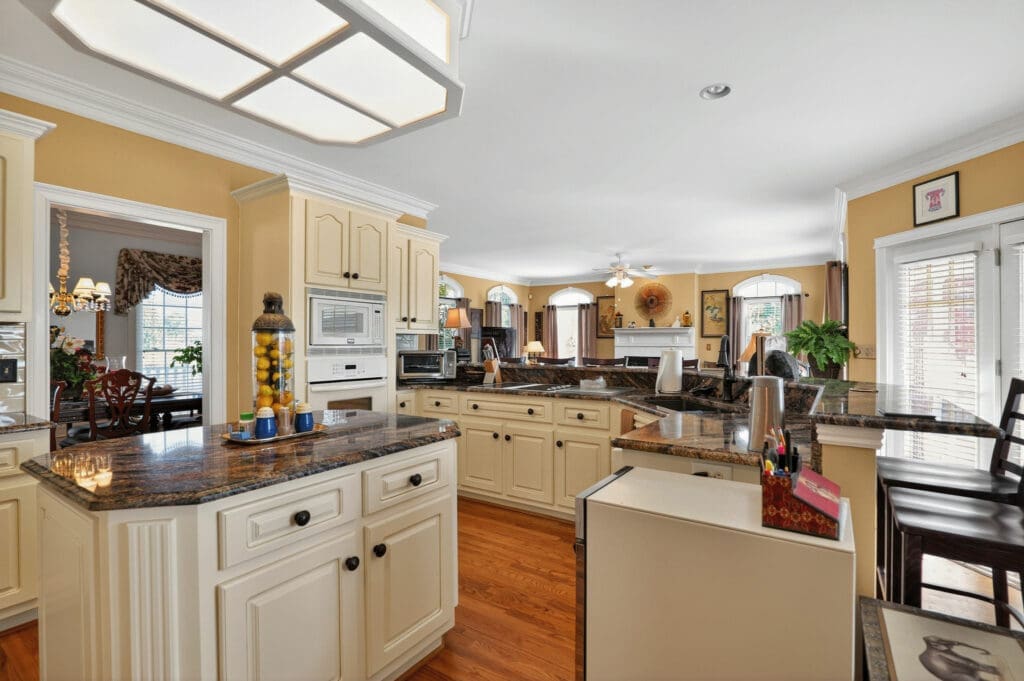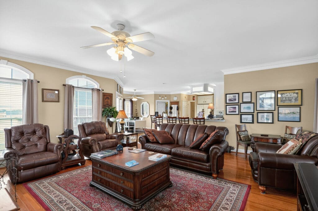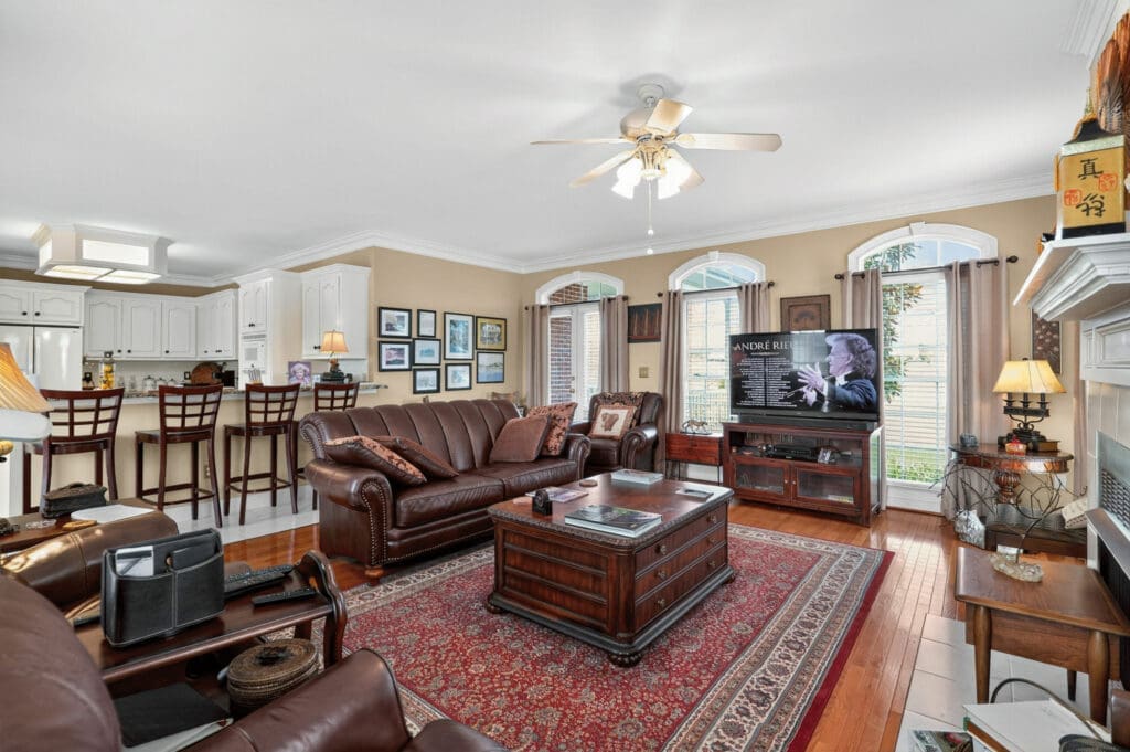 The front porch spans the width of the home and wraps around one side, leading to a spacious gathering room with an open flow to the kitchen, breakfast nook, and covered back porch—ideal for entertaining or quiet mornings.