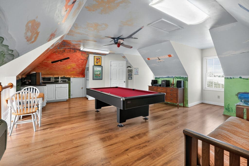 The 62′ x 42′, 2,600 sq ft detached hangar is a standout feature, with a sliding door offering 40′ horizontal and 10′ 3″ vertical clearance. Two dormers bring natural light into the space, and the door can be widened if needed.