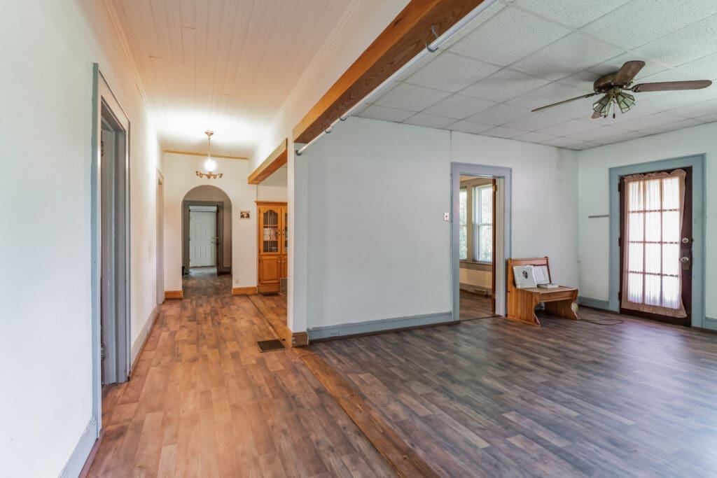 Constructed of rough‑cut heart pine and solid oak, the home has excellent bones and invites further customization. Some cleaning and repairs are still needed; the property is offered as‑is, with potential price flexibility.
